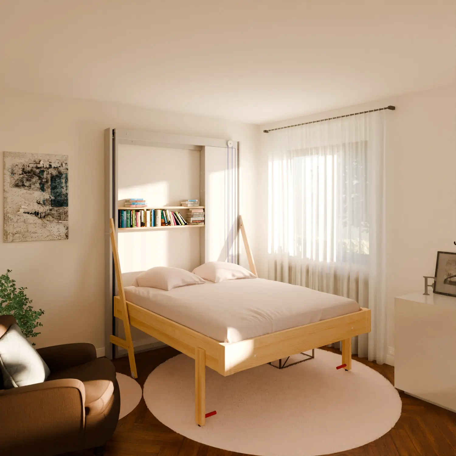 Le lit escamotable avec étagère  a été pensé pour ceux qui veulent tout avoir dans un petit espace : un vrai lit confortable et du rangement intégré sans sacrifier l’esthétique. L’étagère Tana s’intègre directement à la structure du lit Juno pour former un ensemble harmonieux et pratique. Vous bénéficiez d’un espace de couchage de qualité et de rangements ouverts pour vos livres, objets déco ou accessoires du quotidien.